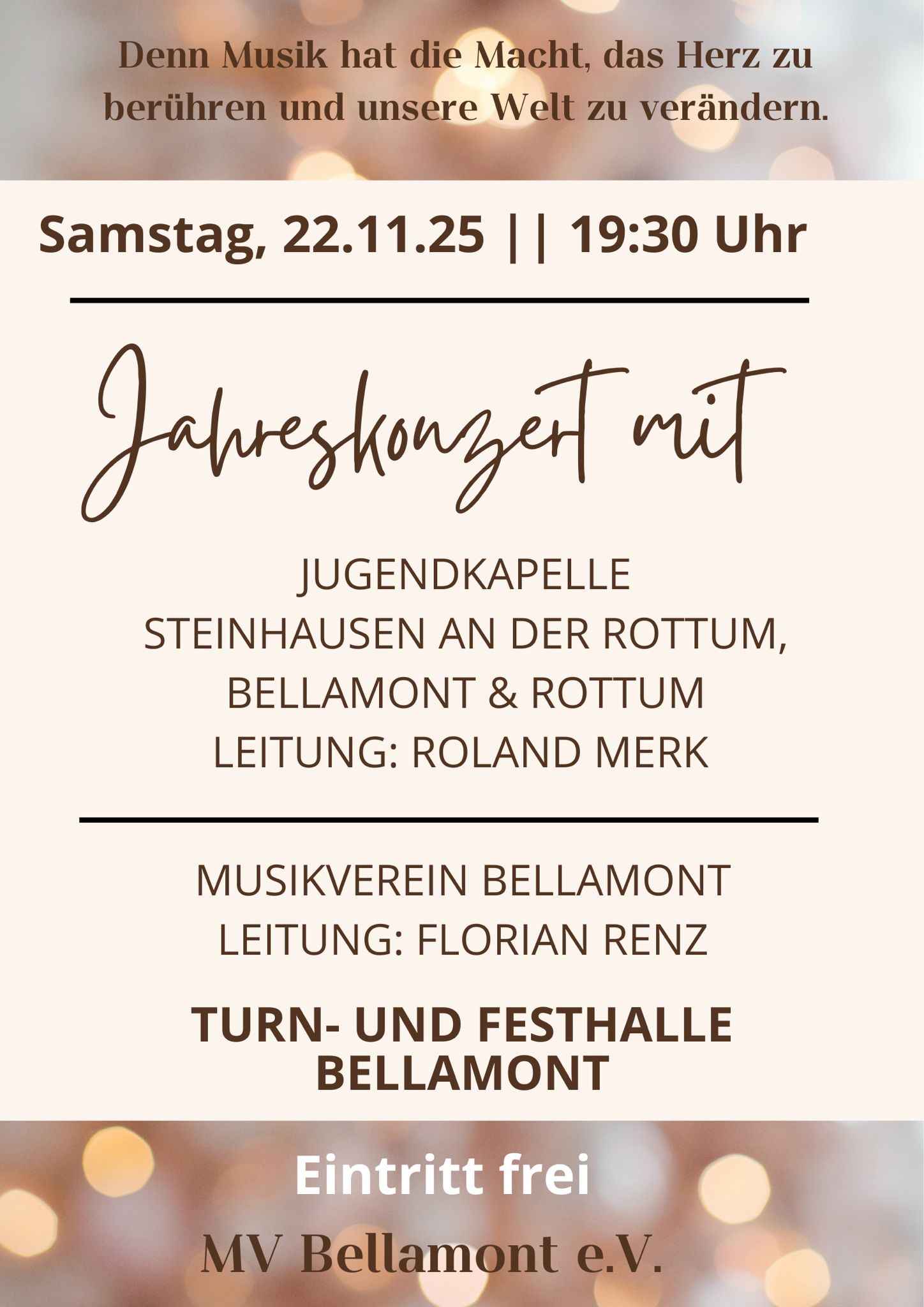 Am Samstag, den 22. November 2025, lädt der Musikverein Bellamont zum traditionellen Jahreskonzert in die Turn- und Festhalle Bellamont ein. Beginn ist um 19:30 Uhr.
